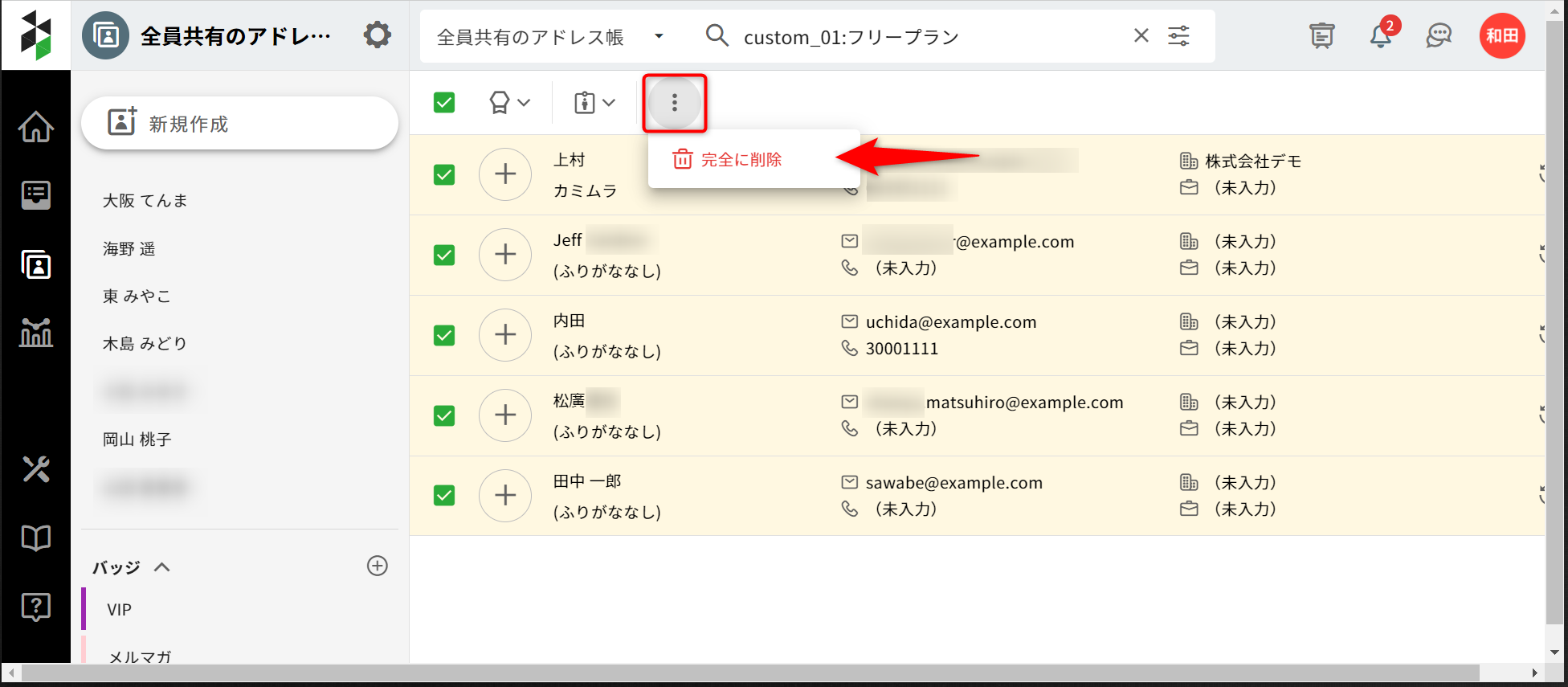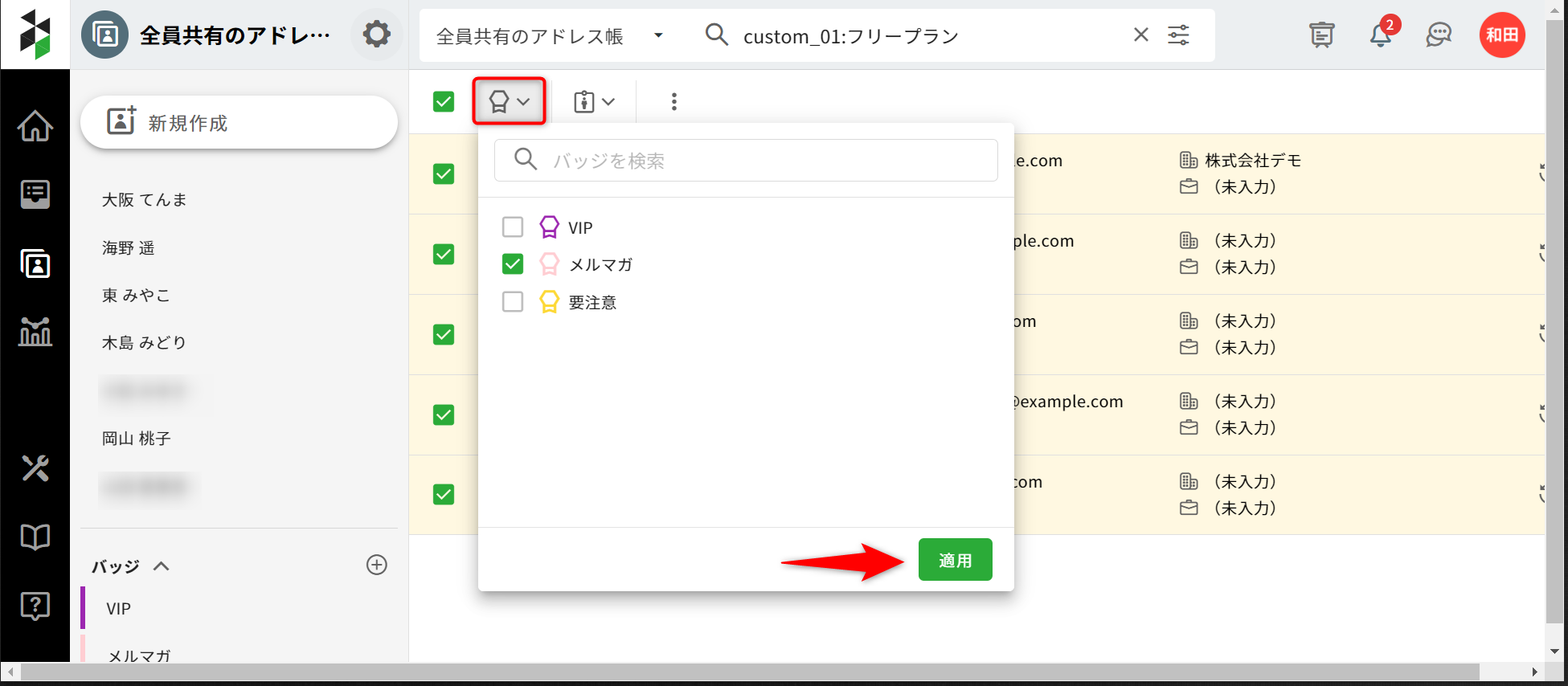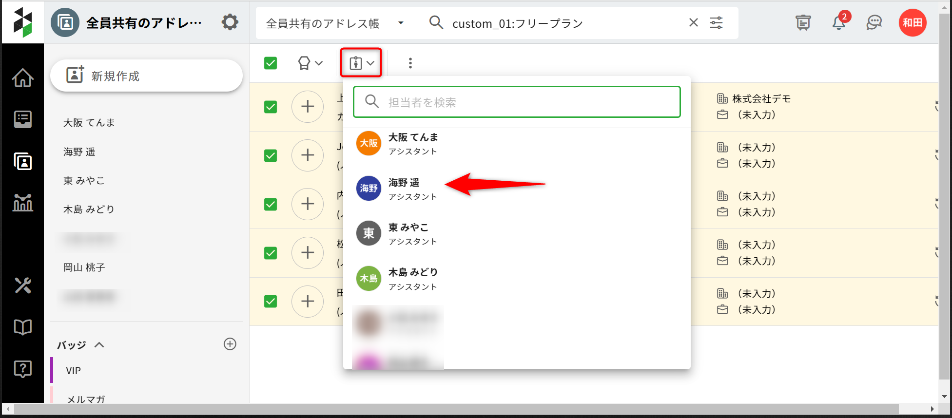 選択したコンタクトに対して、一括でバッジ設定、担当者設定、削除の操作が可能です。ご注意