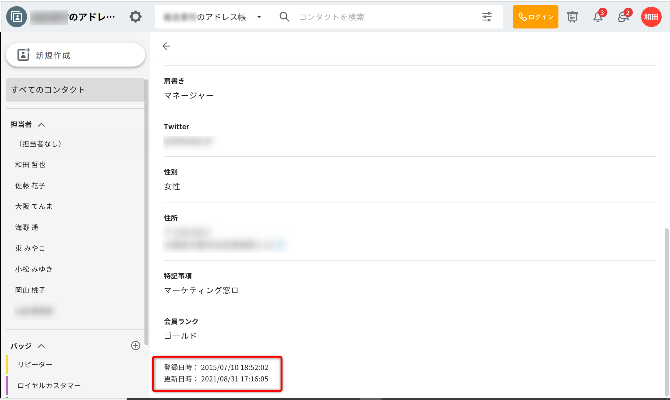 3.コンタクトの詳細画面をスクロールすると、下部にて登録日時・更新日時が確認できます。