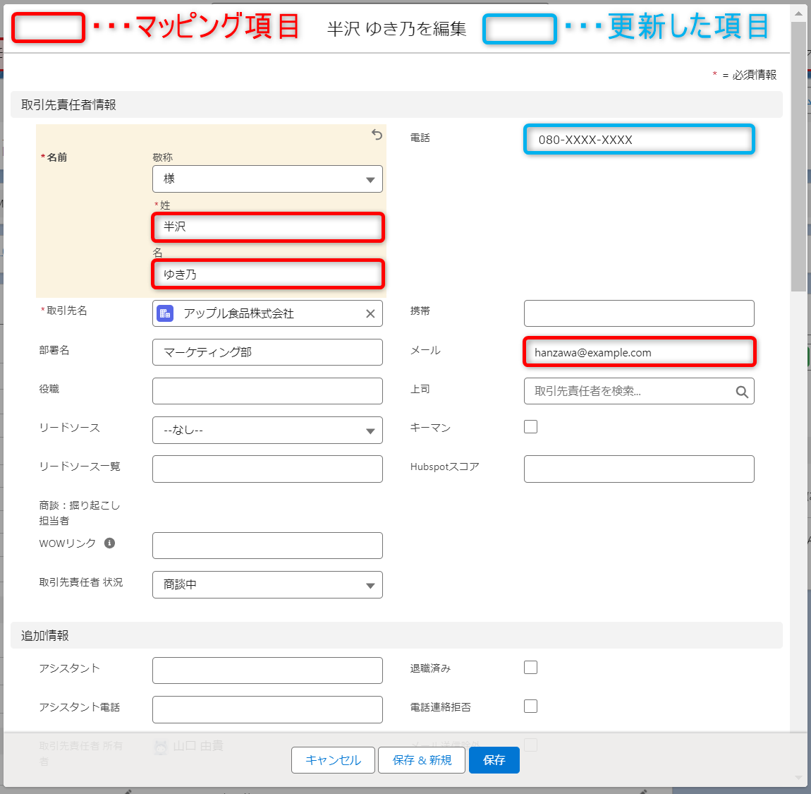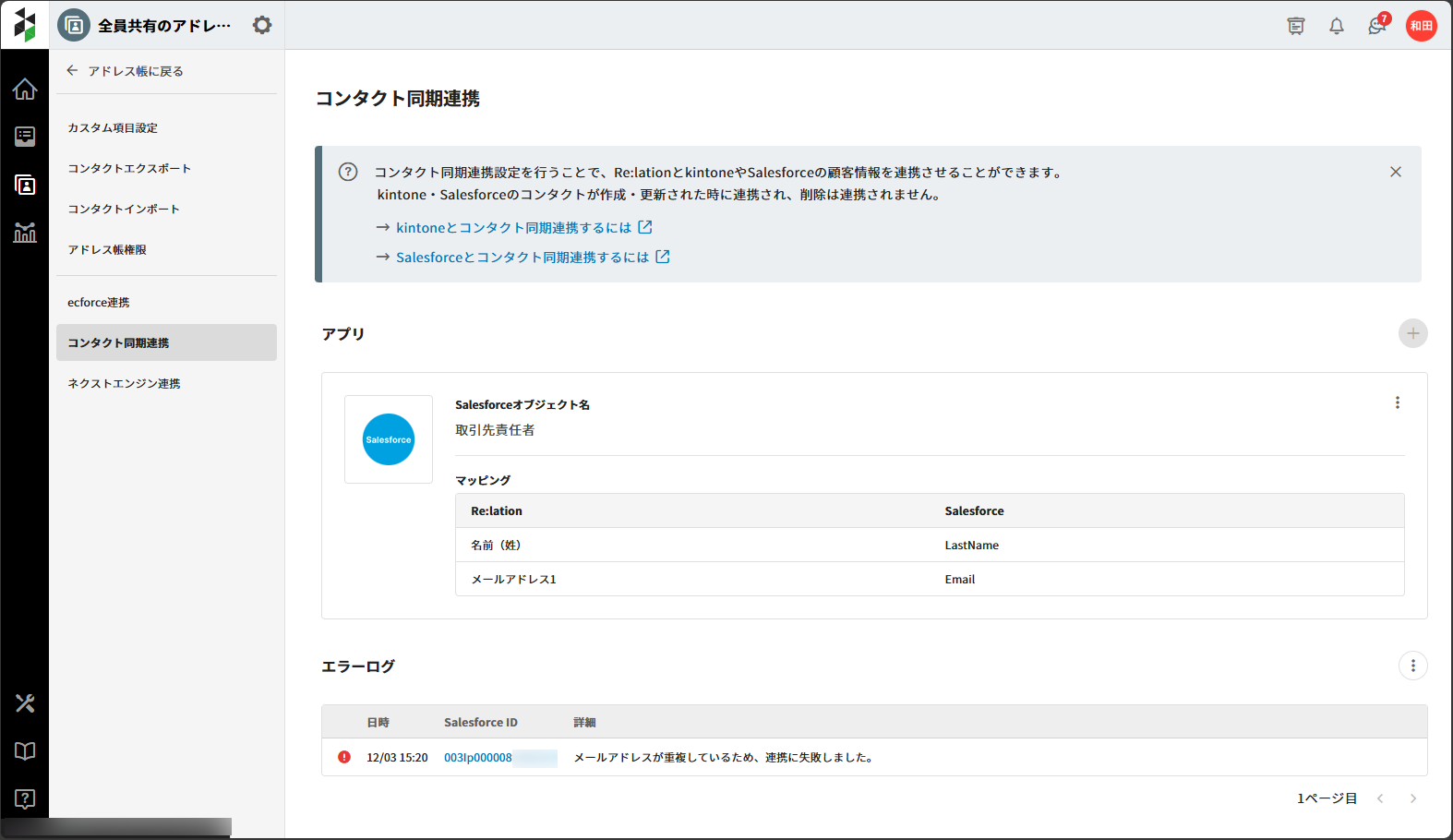 ただし、実際にRe:lationにコンタクト同期される項目は、マッピングした項目のみとなります。同期連携にて作成・更新されるコンタクトについて・Salesforceから取得した情報には、レコードの情報の他にレコードの内部ID(Salesforce ID)が含まれます。