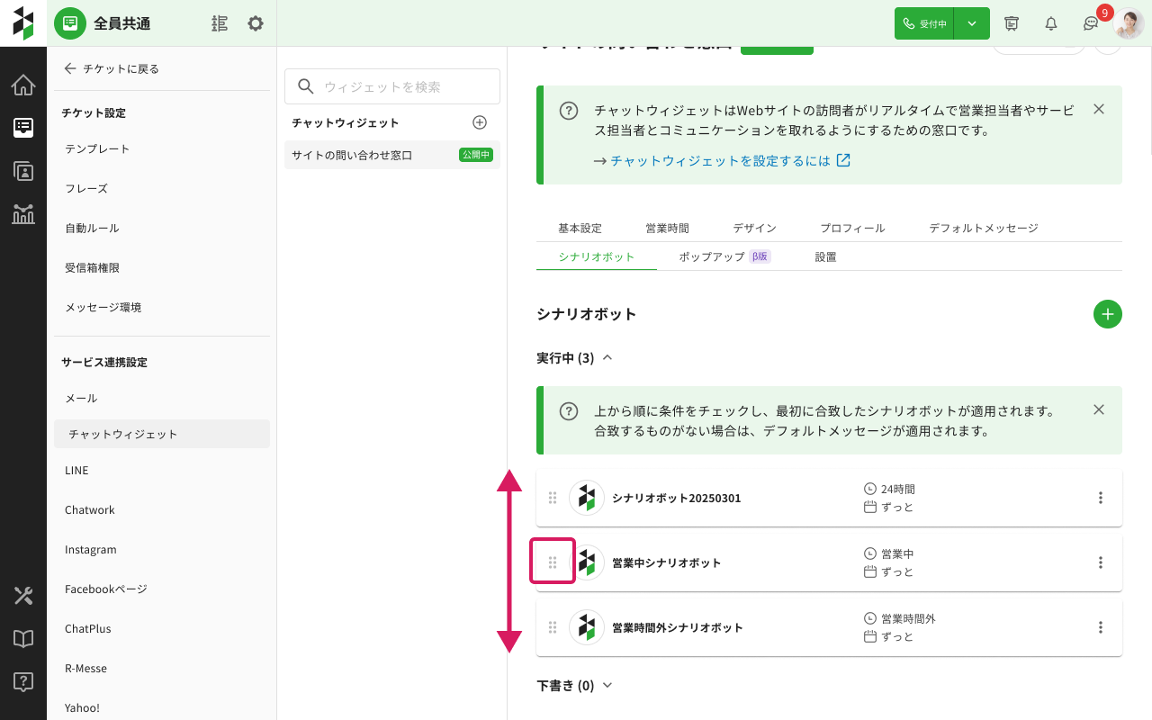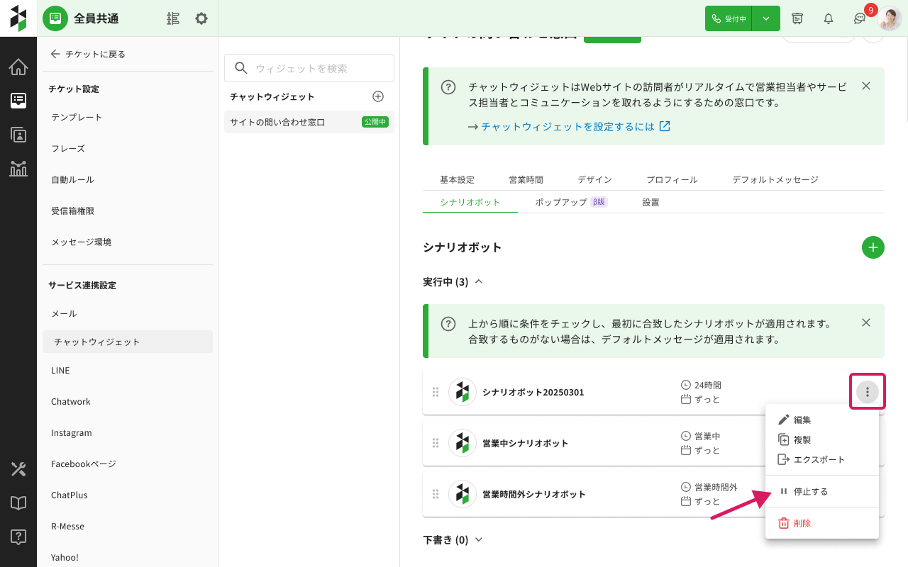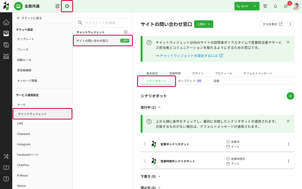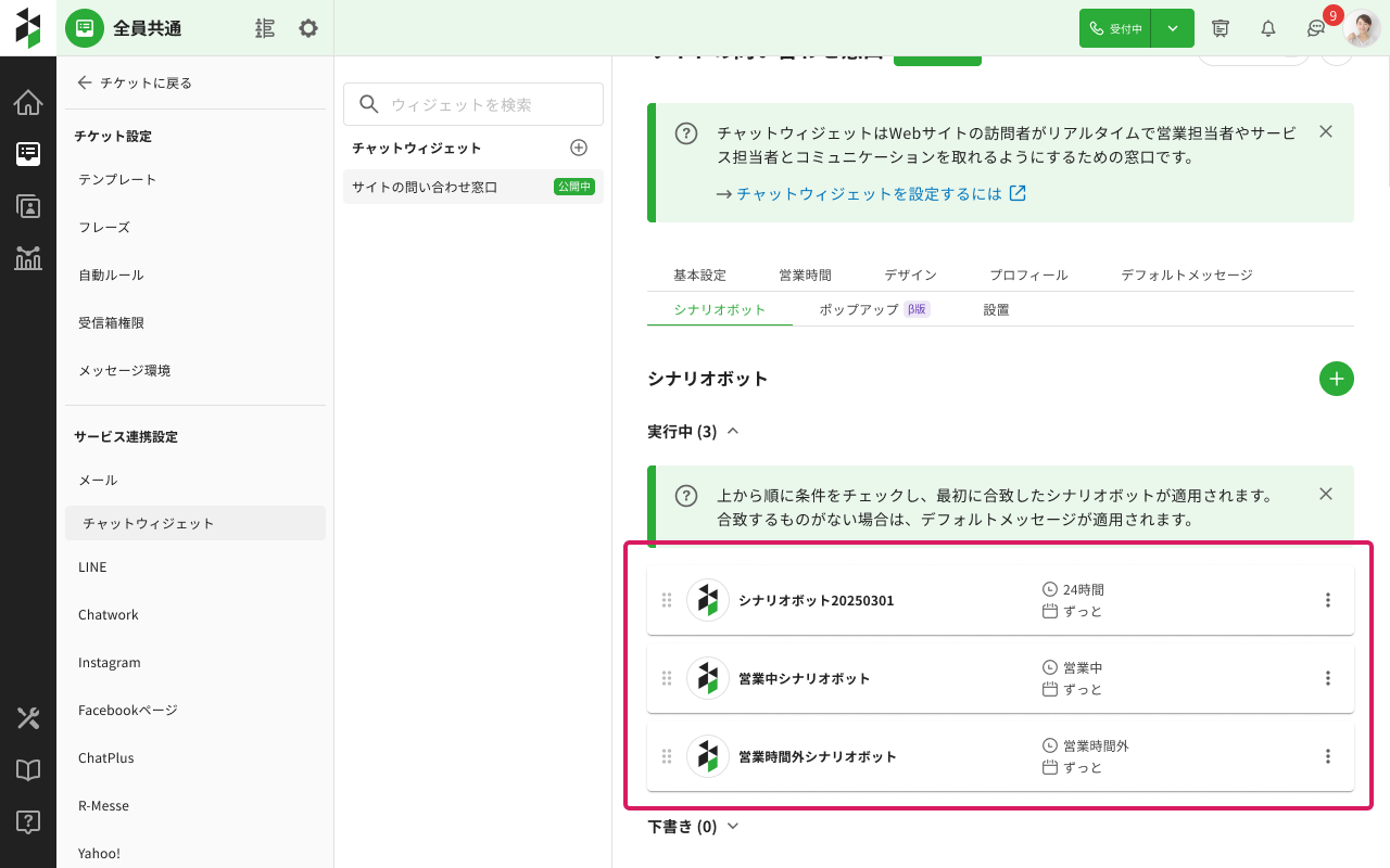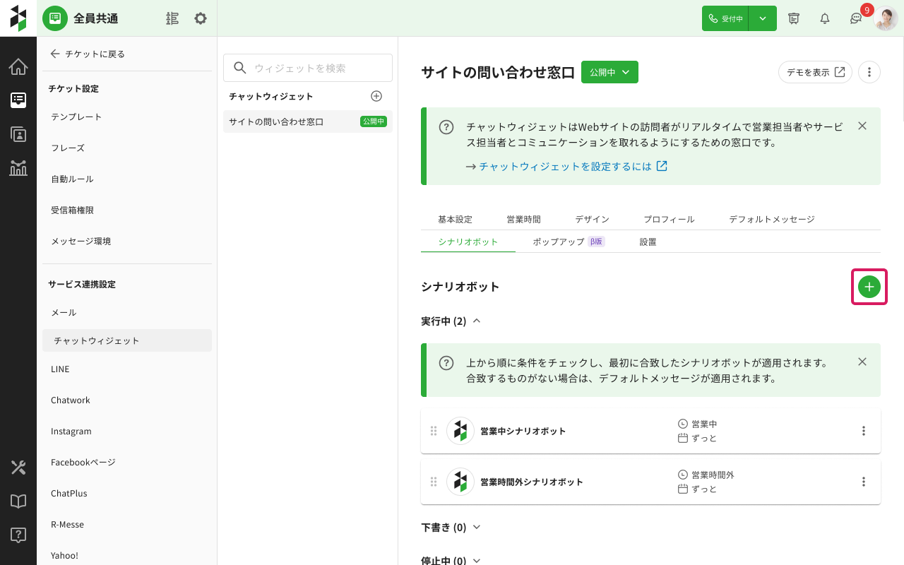 初めてチャットウィジェットを作成すると「営業中シナリオボット」「営業時間外シナリオボット」が作成されます。