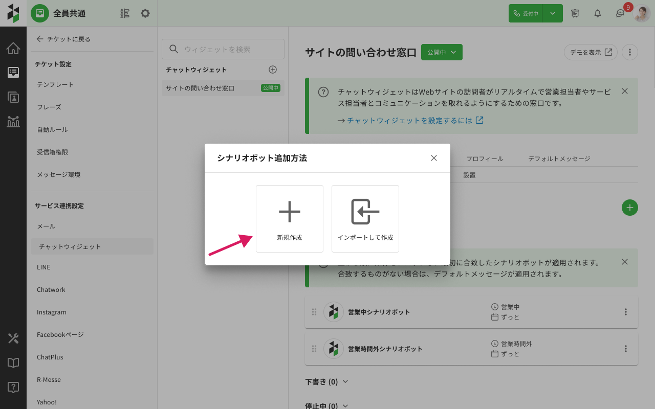 ・シナリオボットを設定する前に、チャットウィジェットを作成する必要があります。