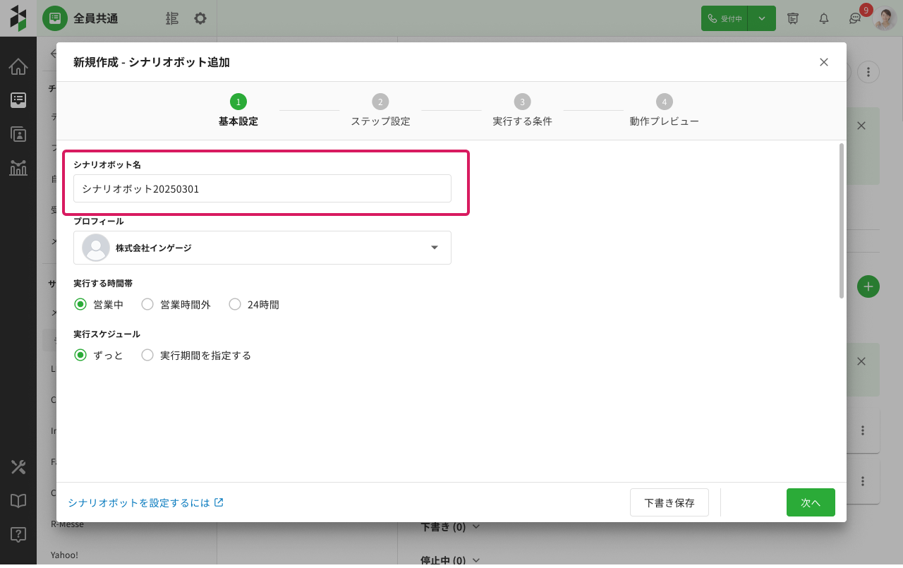 3.基本設定の編集画面が開きます。「シナリオボット名」より、シナリオボットを任意の名前に変更できます。
