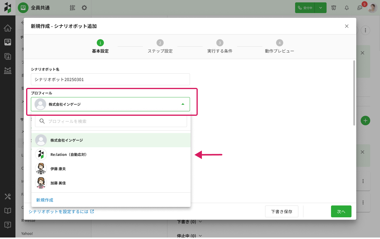 4. 「プロフィール」より、ボットの発言をするプロフィールを選択します。