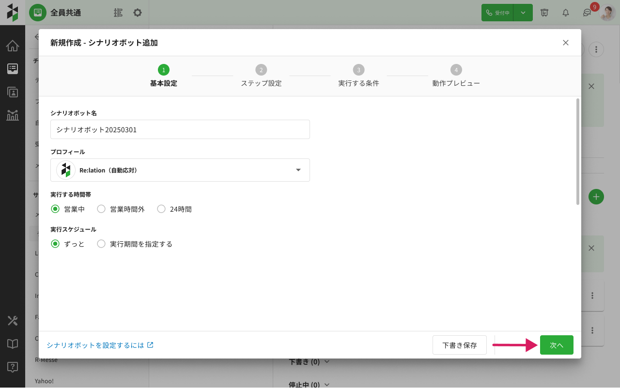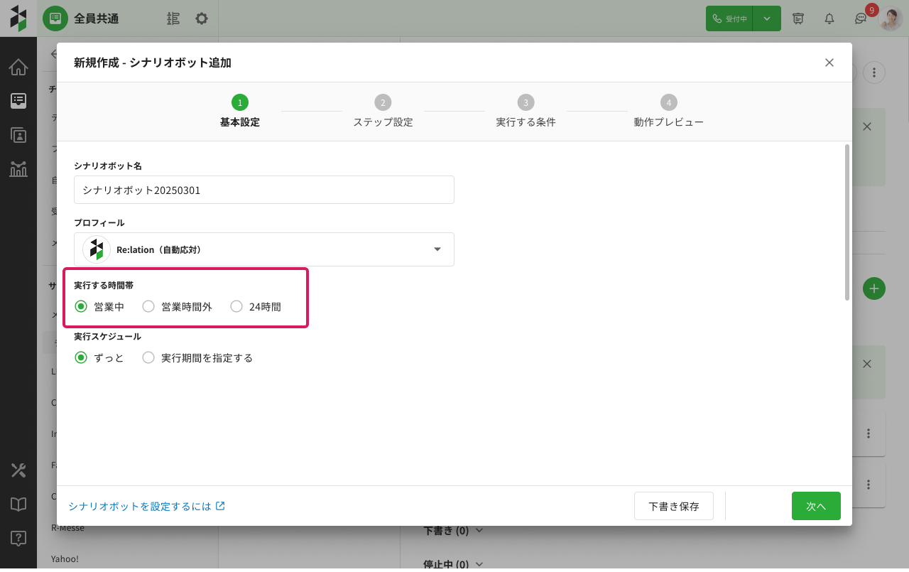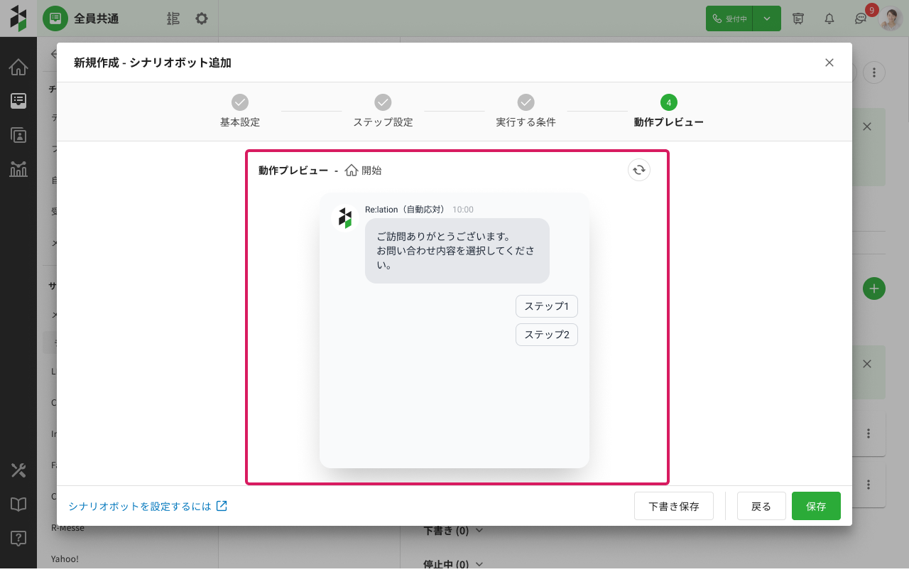 実行中 条件に合致した場合、設定したシナリオボットが表示されます。