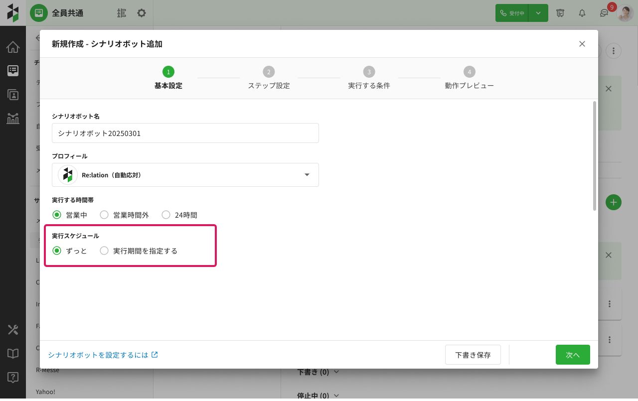 6.「実行スケジュール」では、このシナリオボットが表示される期間を設定可能です。