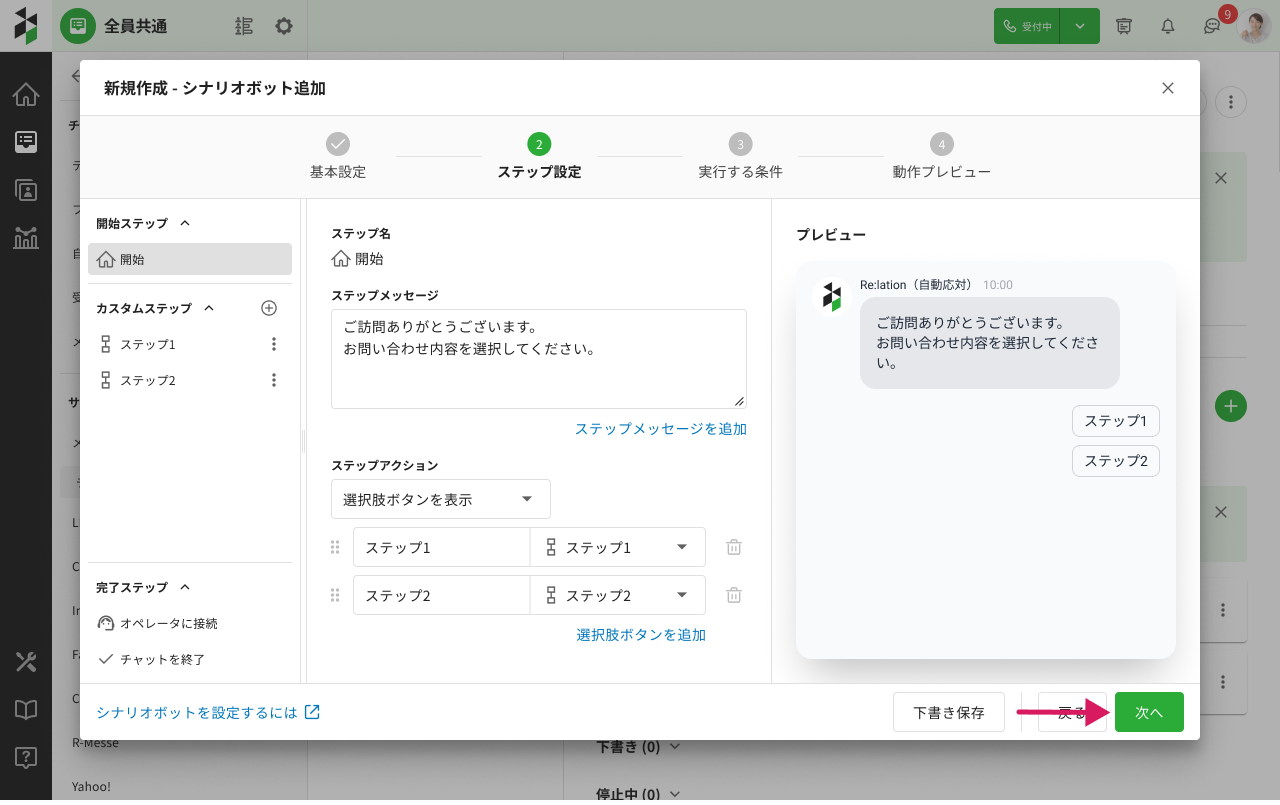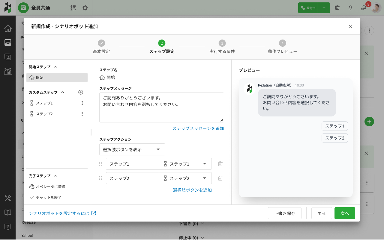 1つのステップが発動した後に、さらに次のステップを発動させたり、オペレータに接続したりすることができます。