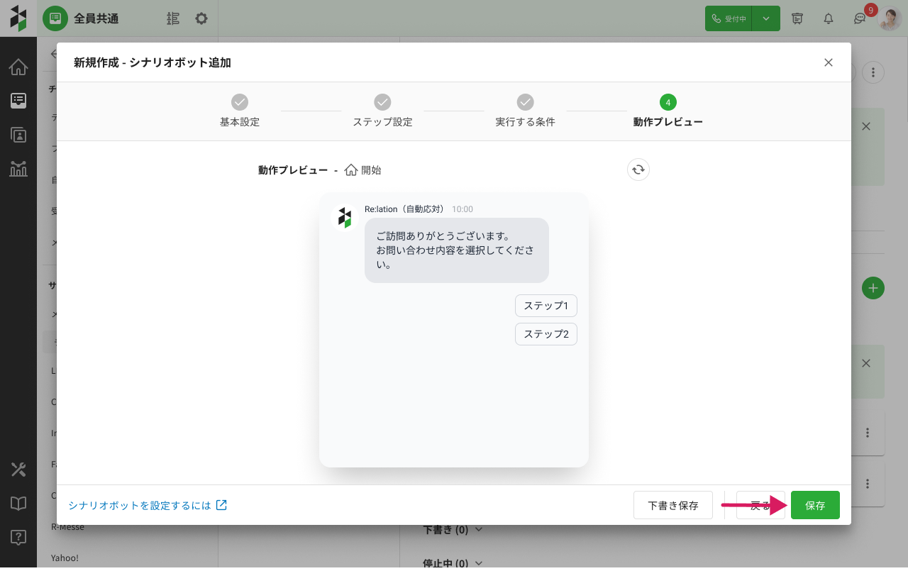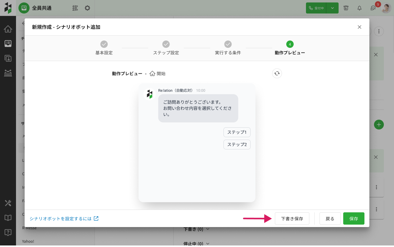[下書き保存]を押下した場合、シナリオボットは[下書き]に保存されます。
