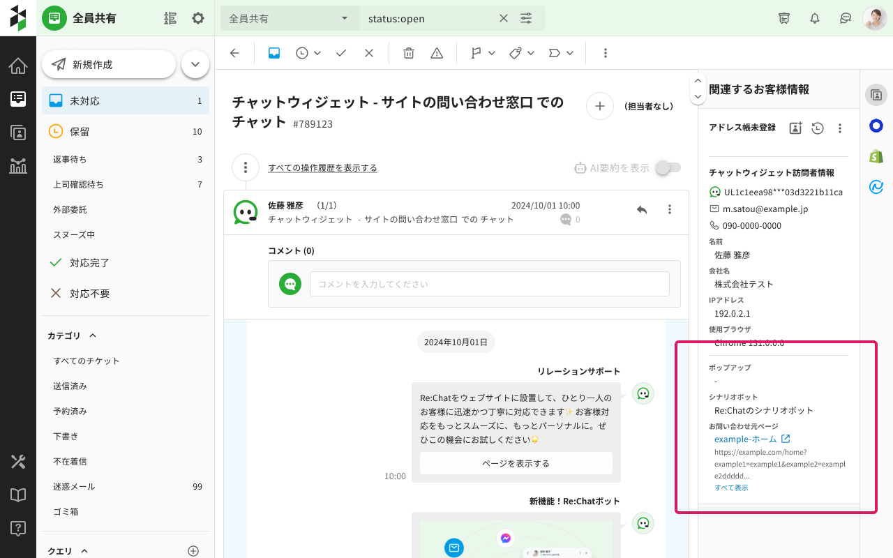 チャット受信時、チケット詳細画面の[関連するお客様情報]内にある「チャットウィジェット 訪問者情報」から、