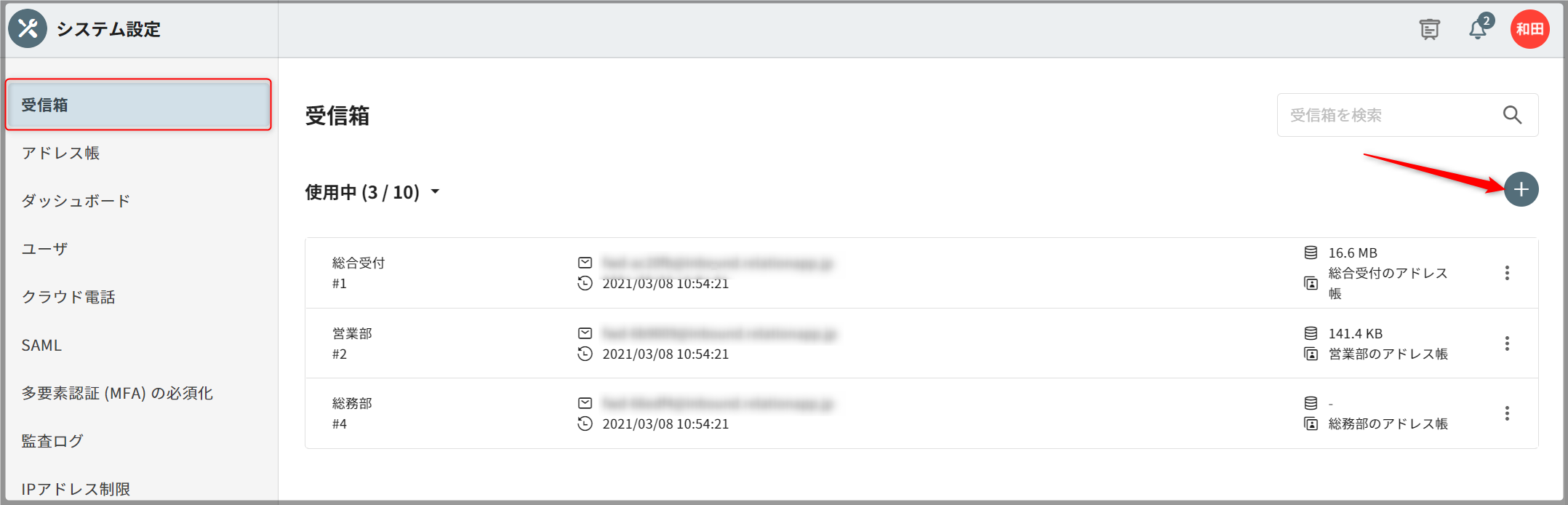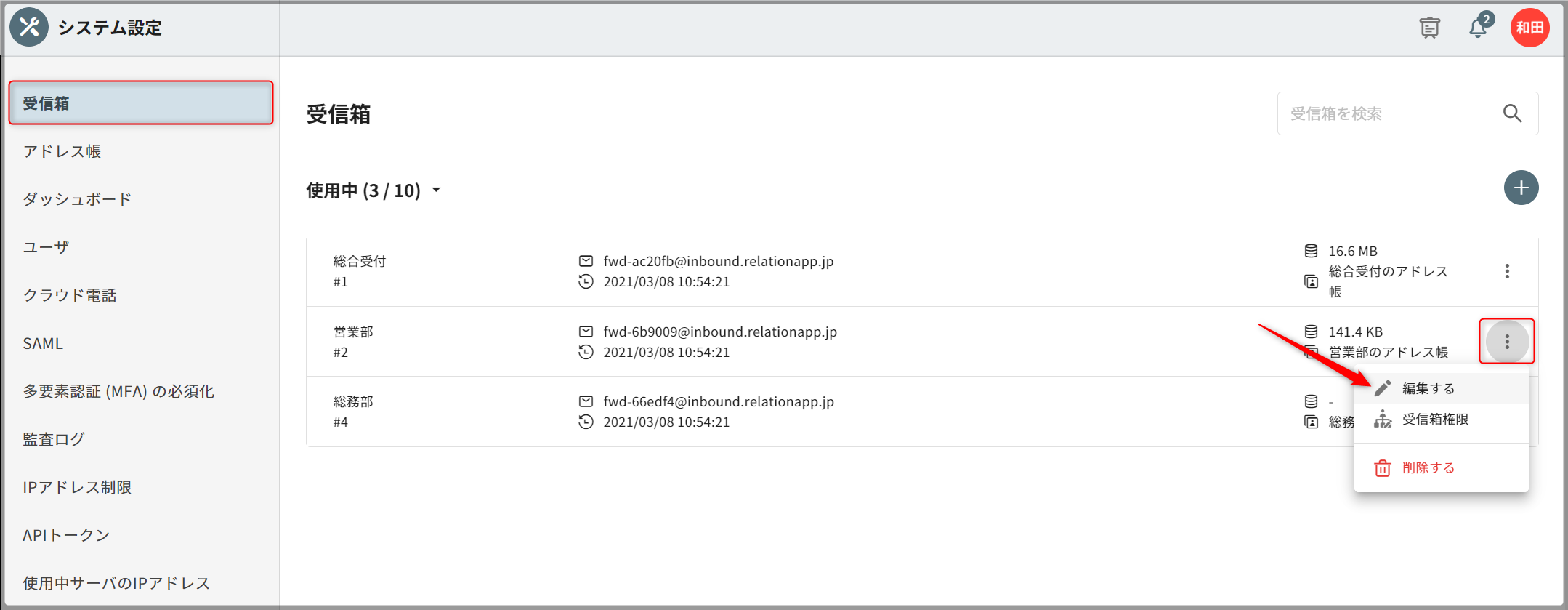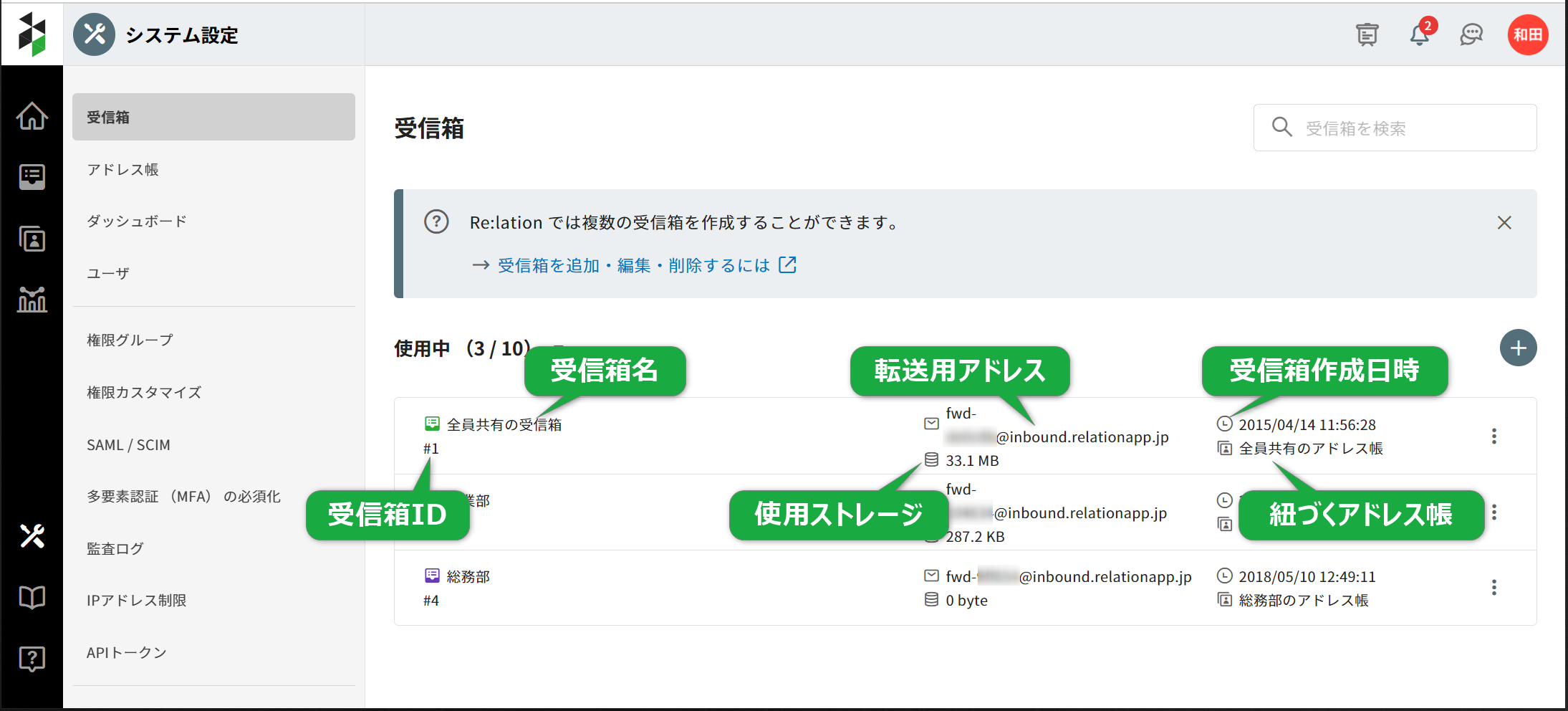 受信箱の追加・編集・削除は、 アカウントオーナーのみ可能です。Re:lation では複数の受信箱を登録することができます。登録可能数はご契約のプランにより異なります。