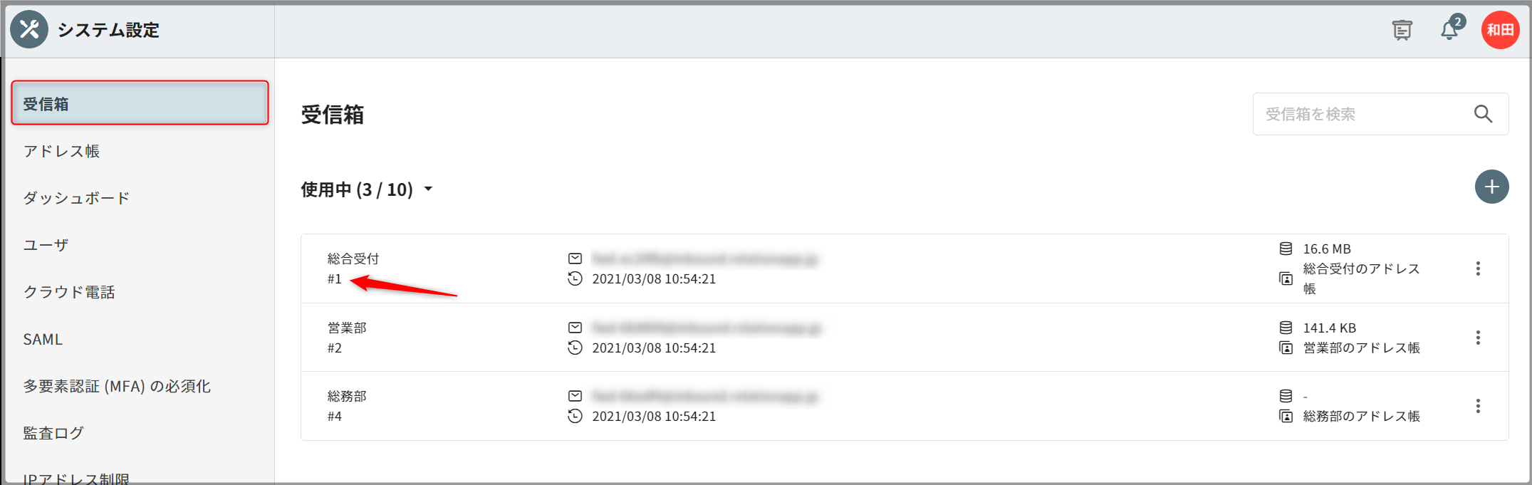 受信箱作成後、受信箱の一覧では以下情報が確認できます。受信箱にユーザ権限の設定をするには