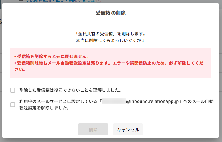 受信箱を削除する場合は、確認メッセージが表示されます。