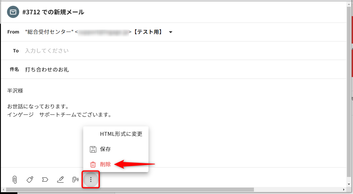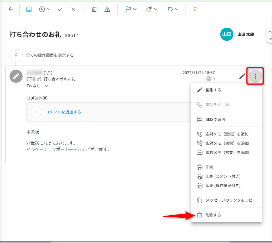 1.該当の下書きを選択し、チケット詳細画面を表示します。2.右上のメニューアイコンから、[削除する]を選択すると削除完了です。
