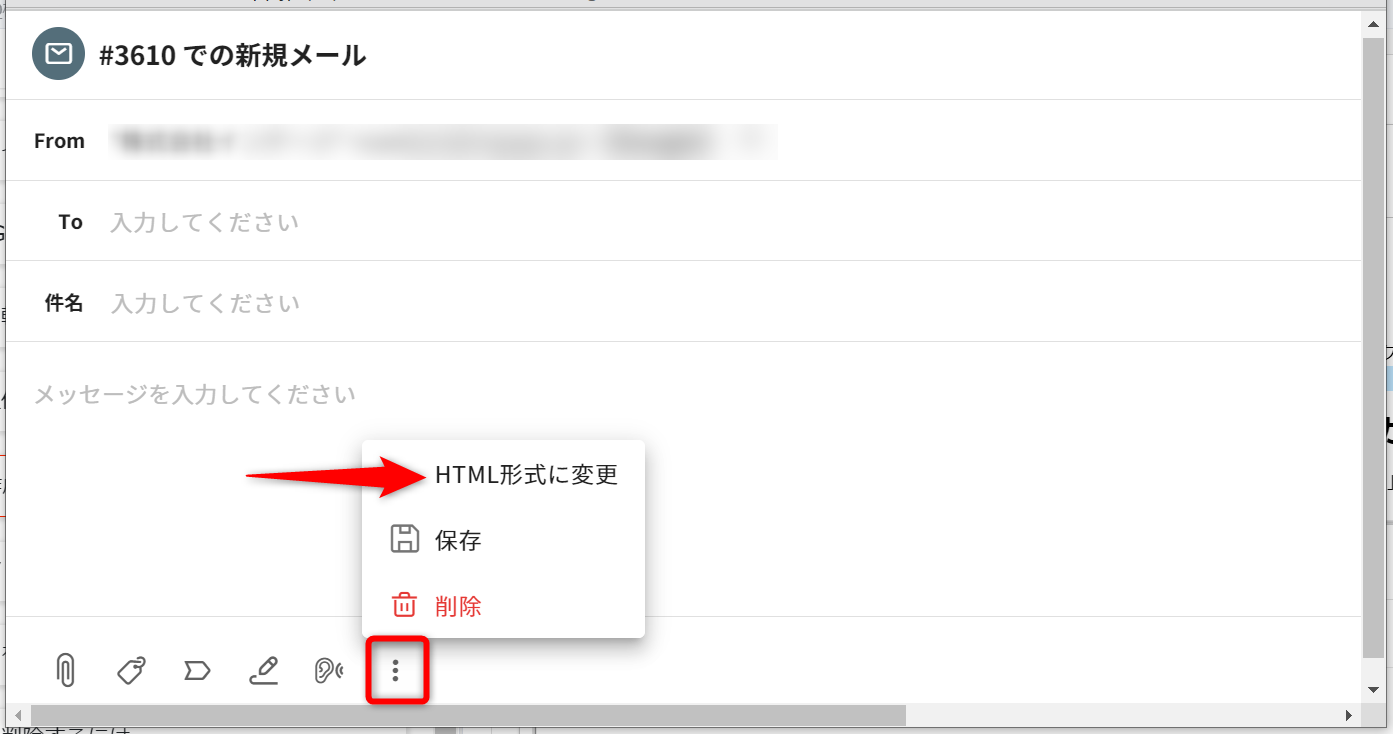 HTML形式・プレーンテキスト形式の切り替え方法HTML形式とプレーンテキスト形式を切り替えるには、図で示したスリードットメニューアイコンをクリックしてください。