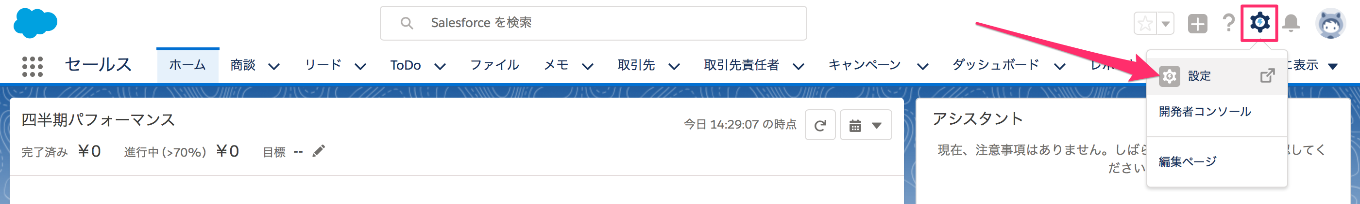 下記の通りに設定します。設定は大きく分けて2ステップです。1.ボタンを作成するSalesforce画面右上の[ギアアイコン]-[設定]を選択します。