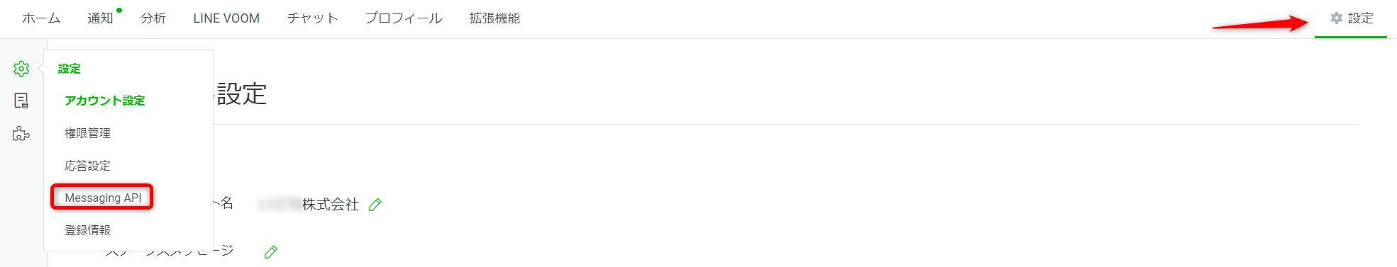 1.LINE Official Account Manager にログインし、右上の[設定]から[Messaging API]を選択