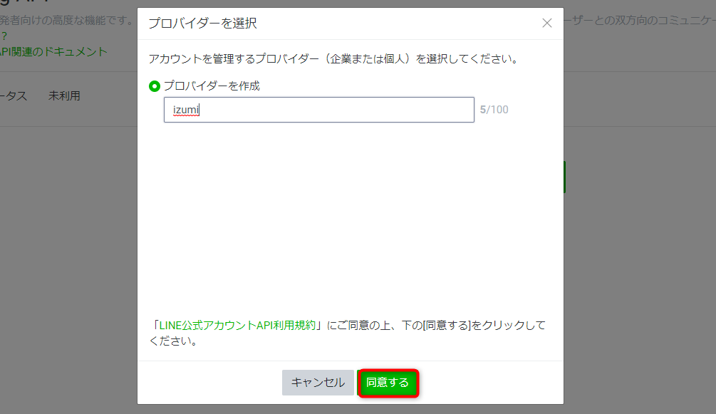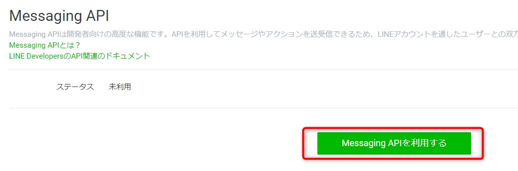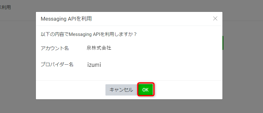 6.その後表示されるダイアログにてOKをクリックすると、Messaging APIが利用できるようになります。