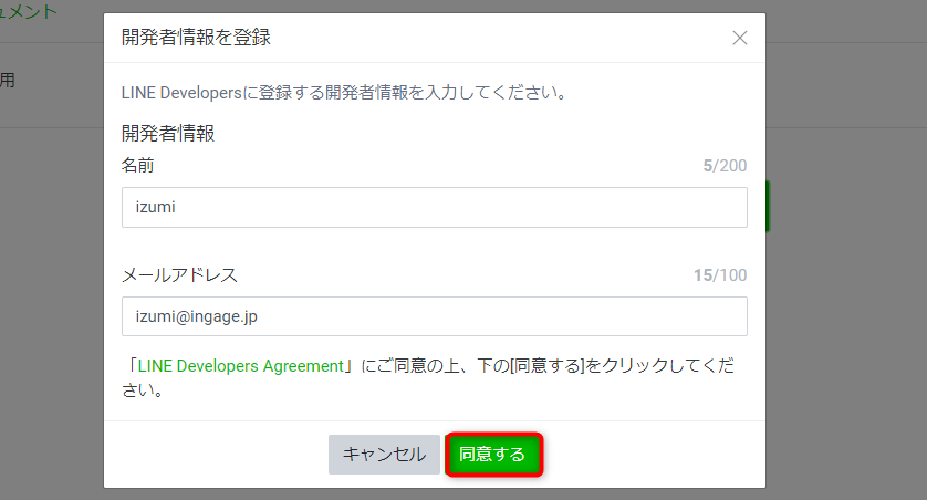 3.開発者情報の登録をします。(このメールアドレスにはLINEからのお知らせのメールが届きます)