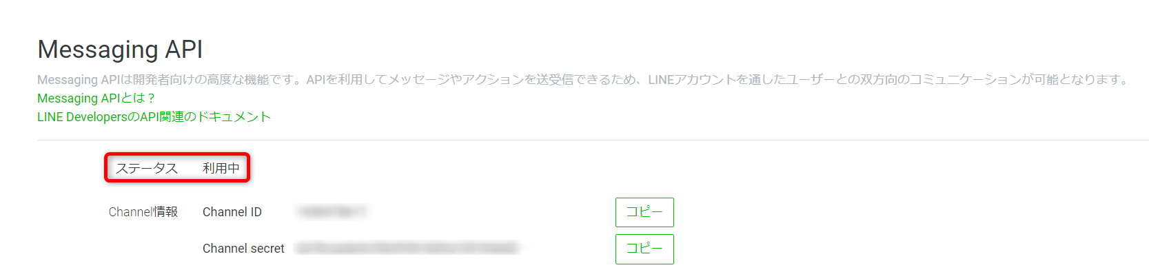 7.ステータスが[利用中]になり、Channel情報が表示されます。
