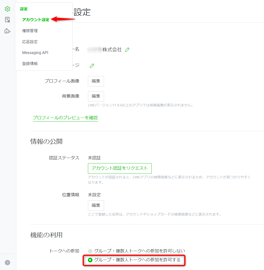 [アカウント設定]-[機能の利用]から「グループ・複数人トークへの参加を許可する」にチェックを入れます。