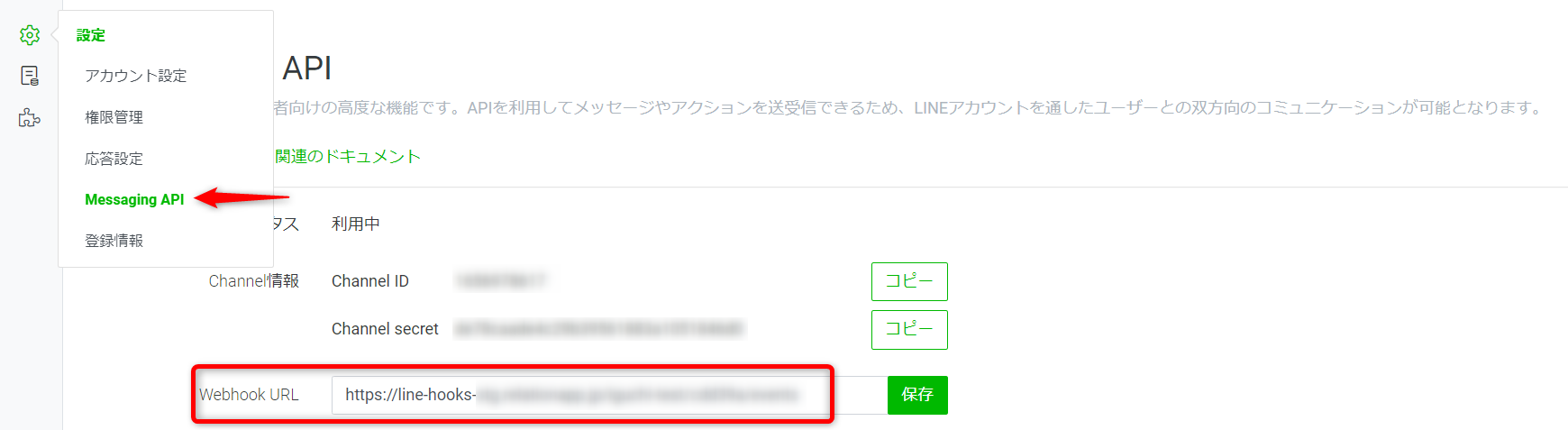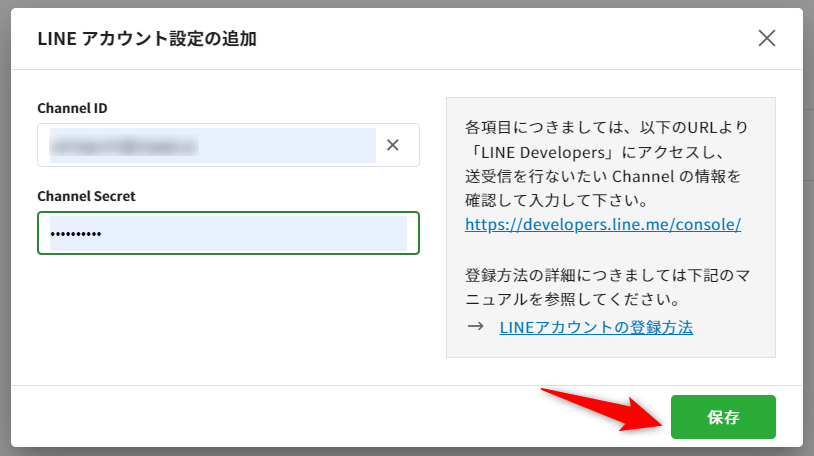 Messaging APIに表示されているChannel IDとChannel Secretを入力し、[保存]ボタンをクリックしてください。