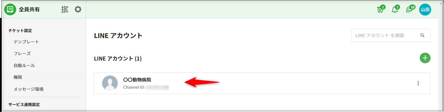 2.[LINE]を選択後、右に表示されている[+]ボタンをクリックします。