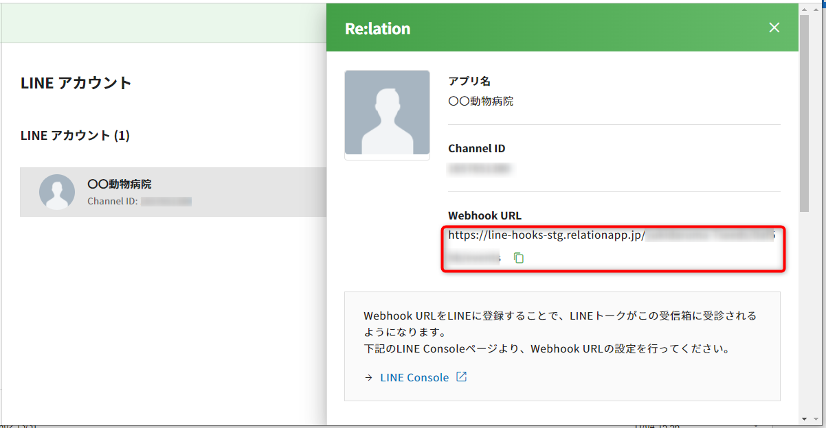 4.[保存]ボタンをクリックした後、設定したLINEアカウントをクリックすると、Webhook URLが表示されます。