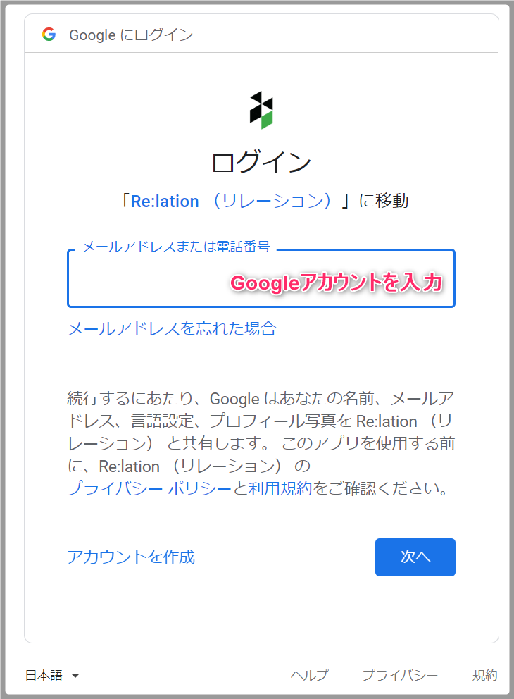 4.Googleのログイン画面に遷移するので、Re:lationで使用したいアカウントを入力します。
