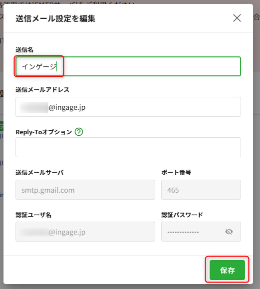 2.編集ダイアログが開くので、「送信名」を変更し[保存]をします。