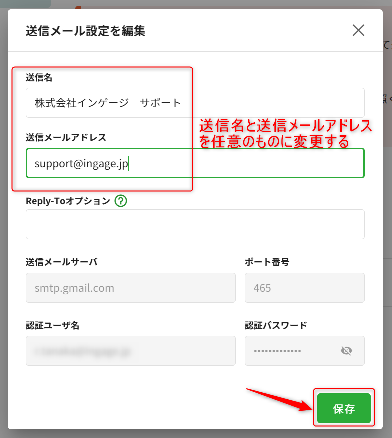 3.送信メールアドレスと送信名をグループアドレスのものに変更し、[保存]します。