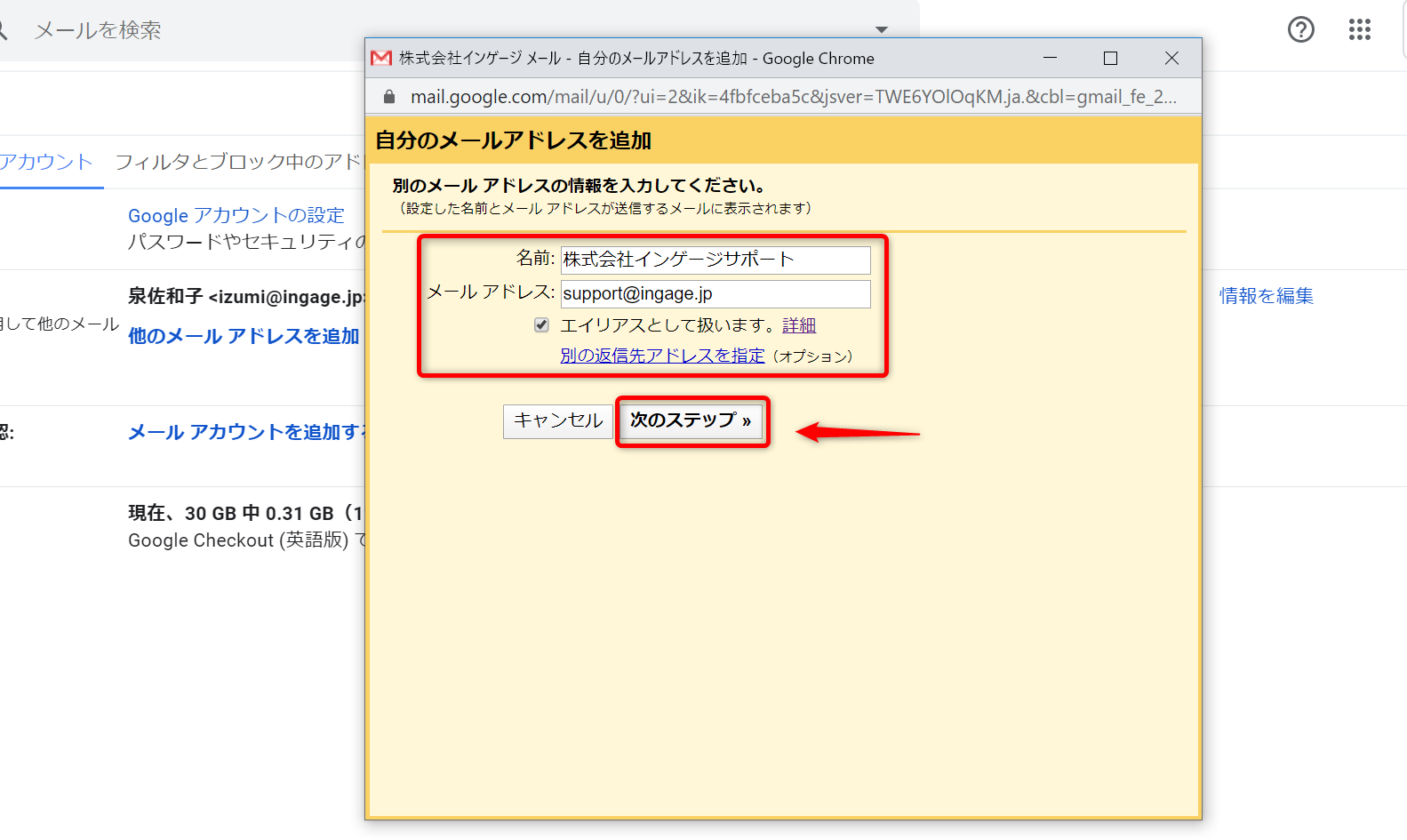 3.グループアドレスのメールアドレスと送信名を入力し、[次のステップ]を選択します。
