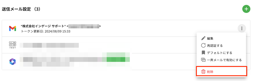 設定右側のメニューアイコン[…]より[削除する]を選択すると、送信設定が削除されます。