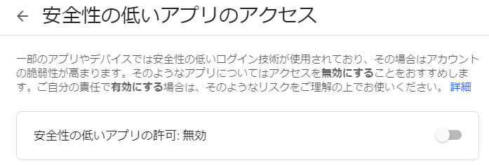 より安全な環境でご利用いただくために、これまで「安全性の低いアプリの許可」を有効にしていた場合こちらを[無効]にすることをお勧めします。