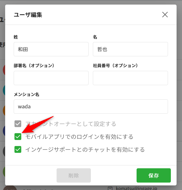 3.[モバイルアプリでのログインを有効にする]にチェックを入れて[保存]します。スマホアプリを使用する使用するユーザが行う手順になります。