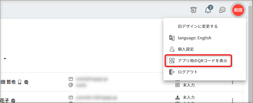 QRコードは、PCブラウザにてRe:lation画面右上のユーザアイコンをクリック>「アプリ用のQRコードを表示」で表示できます。
