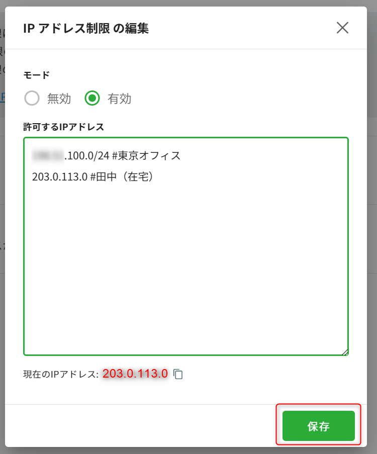 ※アカウントオーナがアクセスしているIPアドレスが含まれている必要があります。注意事項