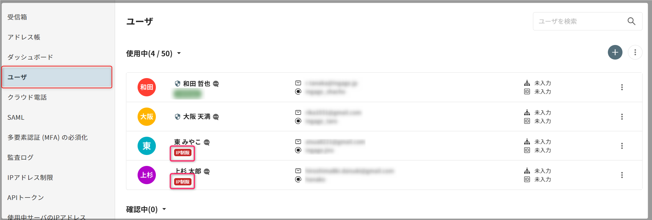 6.[システム設定]-[ユーザ]にて、アカウントオーナ以外の全ユーザは[IP制限中]と表示されます。以上でIPアドレス制限設定は完了です。設定は保存後、最大5分で反映されます。