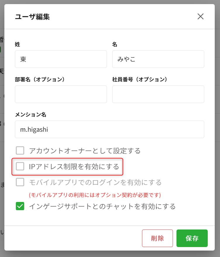 他のアカウントオーナにIPアドレス制限を設定する場合は、次項の「ユーザごとにIPアドレス制限設定をする」の手順にて設定してください。ユーザごとにIPアドレス制限設定をするアカウントオーナ以外にIPアドレス制限をかけたくないユーザがいる場合は、ユーザ設定にて変更が可能です。