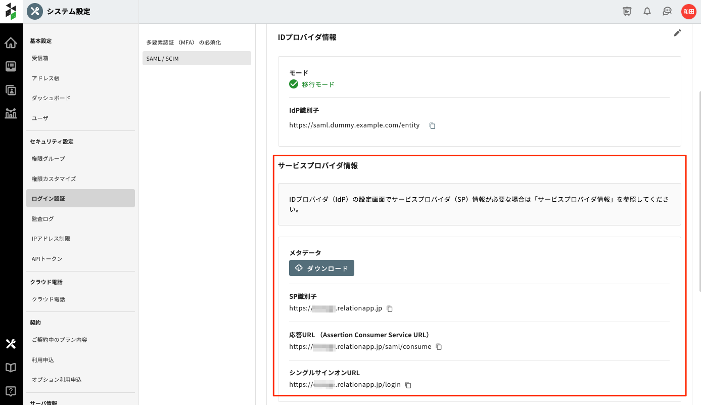 ^https:\/\/ドメイン\.relationapp\.jp\/saml\/consume$ (ドメインはお客様により異なります)7.Re:lationのサービスプロバイダ情報は、Re:lation画面左下の[ツールアイコン] >[ログイン認証]>[SAML/SCIM]から確認できます。