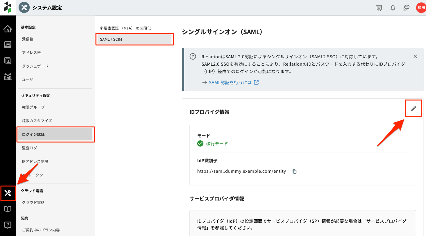 Re:lationにIDプロバイダ情報を設定をする1.Re:lation画面左下の[ツールアイコン] >[ログイン認証]>[SAML/SCIM] を選択し、画面右側の鉛筆アイコンを押下します。