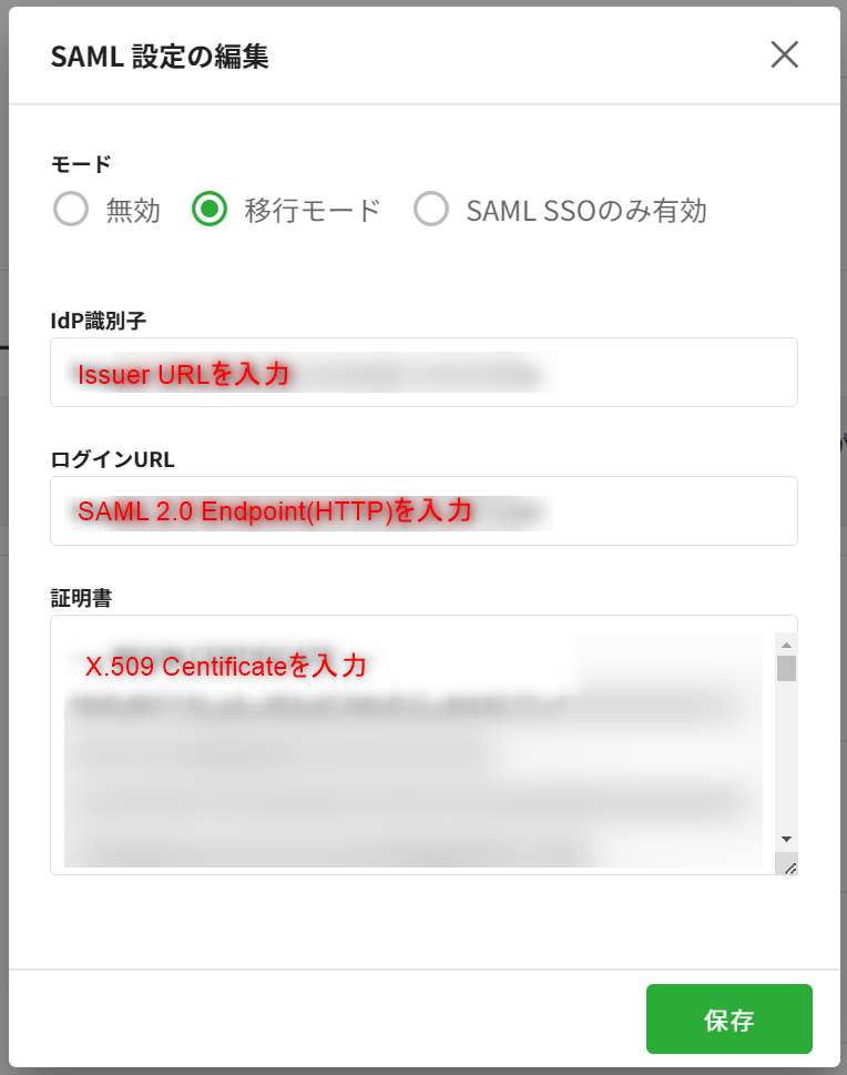 2.モードを選択し、キャプチャを参考に「IdP識別子」「ログインURL」「証明書」の入力をし、[保存]します。