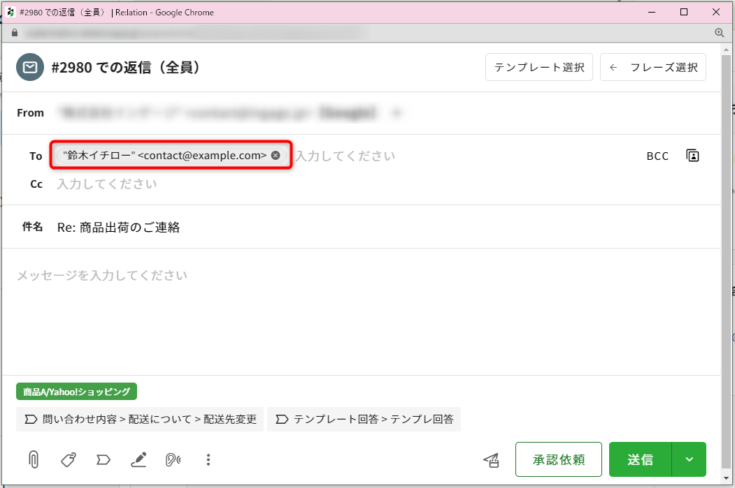 ・名前の最後に「様」を入れているRe:lationでの回避方法Re:lationでは、メール送信時ToおよびCcに設定されたメールアドレスに「名前」が設定されていても、実際の送信時には外します。