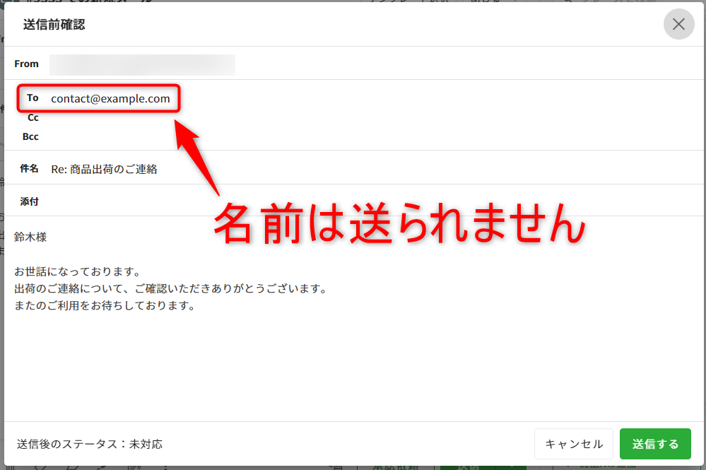 そのため、メールを受け取った側ではメールアドレスのみが表示されます。