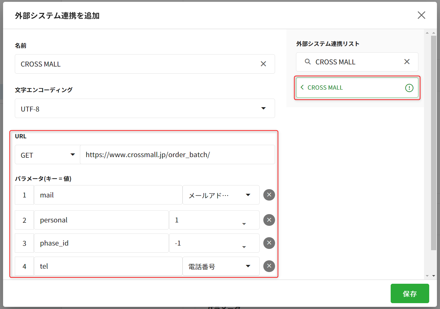 基本設定名前 好きな名前を入力してください。(例: CROSS MALL注文画面) 文字エンコーディング UTF-8 送信方法 (HTTP Method) GET URL https://www.crossmall.jp/order_batch/