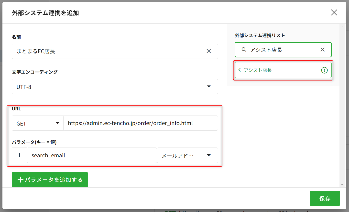 (アシスト店長にアクセスした際のURLに記載されています。)入力が完了しましたら [保存] をクリックしてください。
