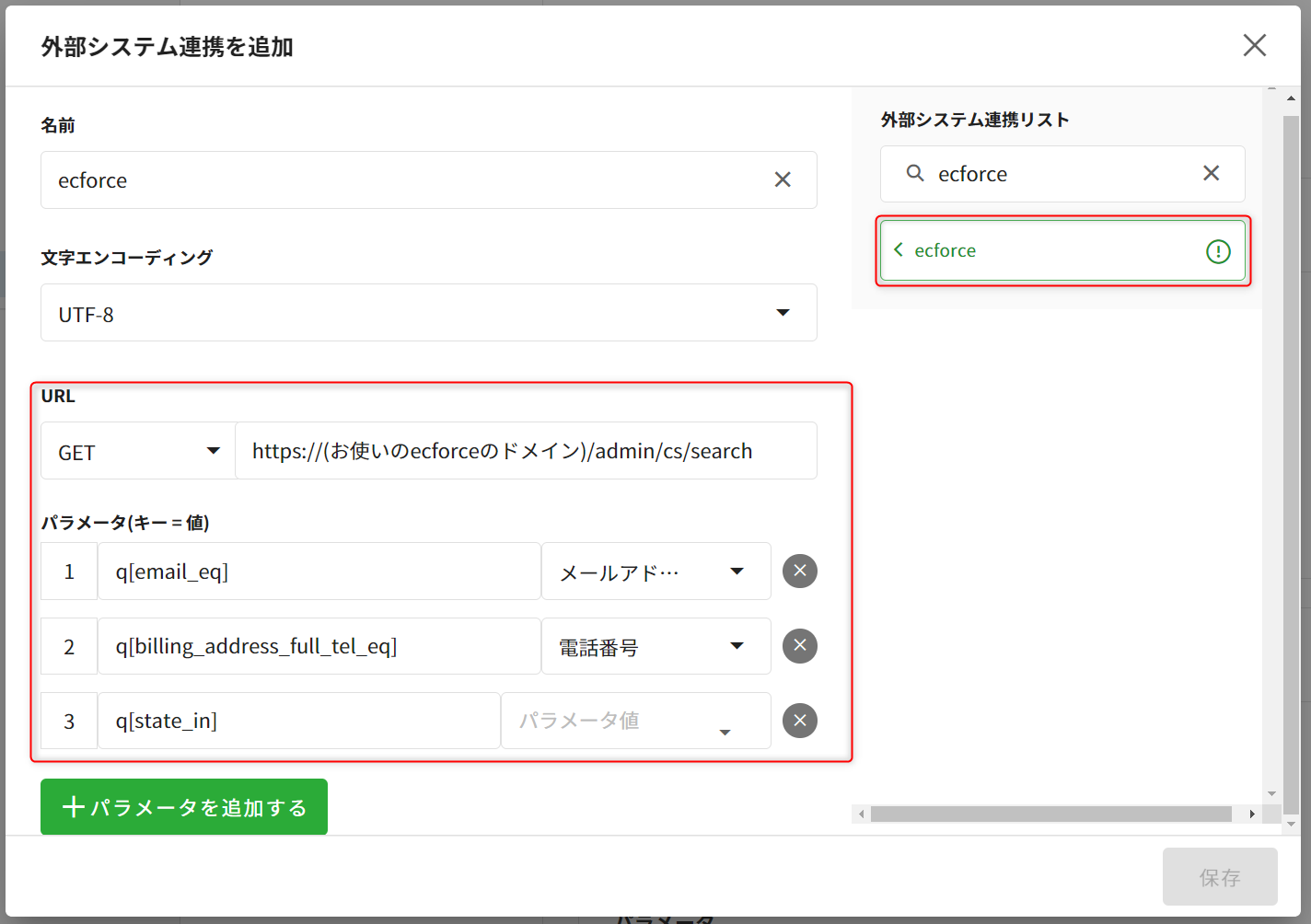 検索条件が絞りすぎると顧客情報が表示されない場合がありますので、適宜調整してください。キー 値 q[email_eq] 「メールアドレス」パラメータを選択(ecforceのE-MAILに反映) q[billing_address_full_tel_eq] 「電話番号」パラメータを選択 q[state_in] (空欄でお願いします) 基本設定