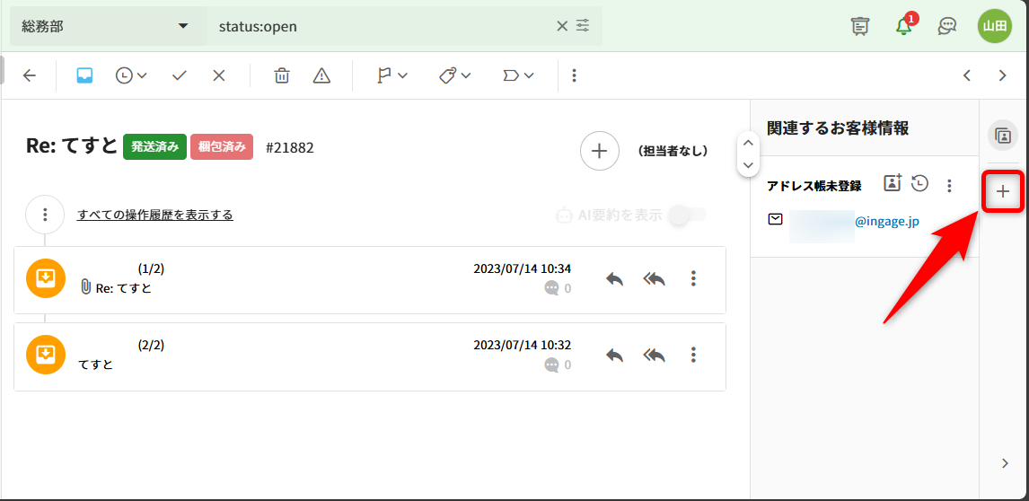 1.連携設定したい受信箱のチケット詳細画面を開き、右端にある[外部連携パネル]にて[+]アイコンをクリックします。