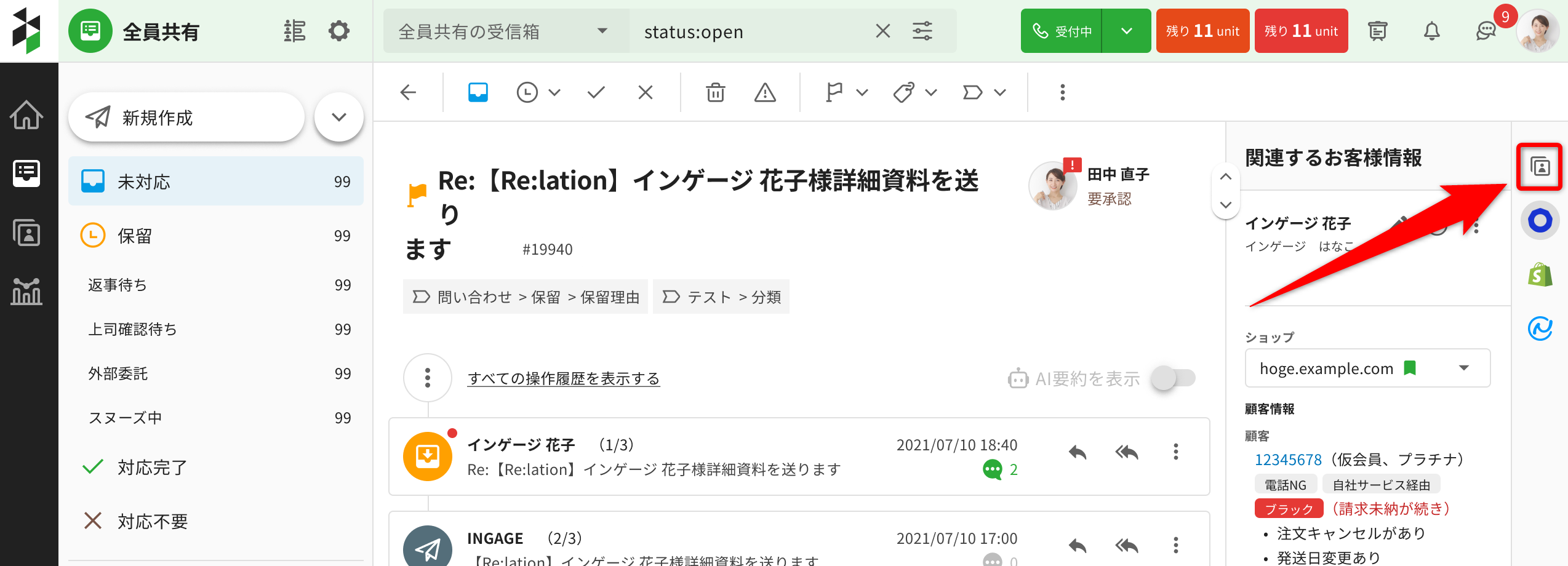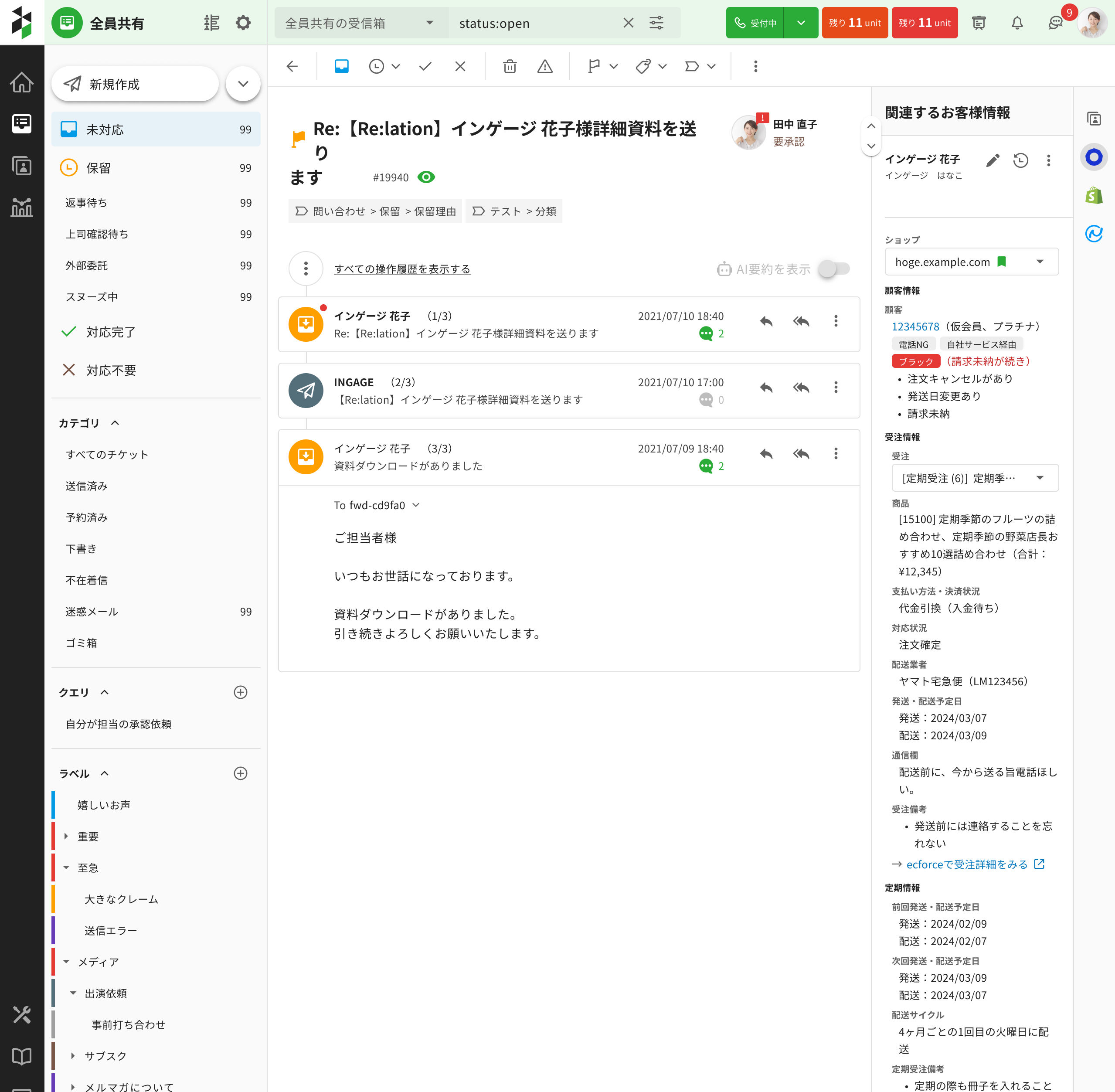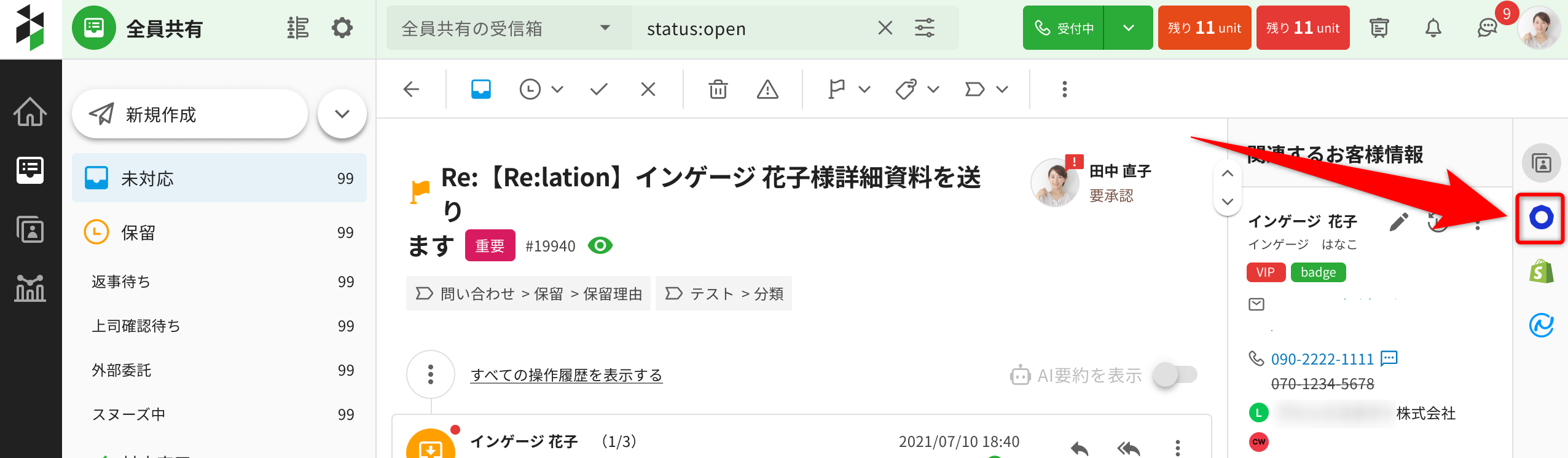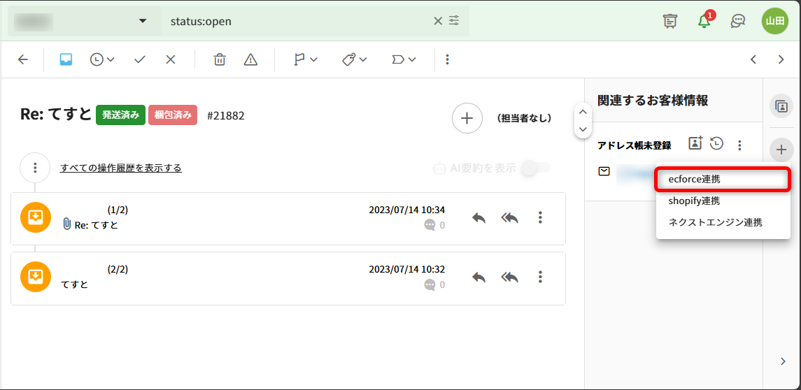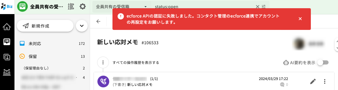 受信箱にてチケット詳細画面を開くとエラーが表示されるため、API接続用ユーザを別途作成いただき、再度連携設定をお願い致します。Re:lationで表示されるecforceの情報について設定が完了したら、届いたメールの右端にある[外部連携パネル]にて[ecforce]アイコンをクリックすると、