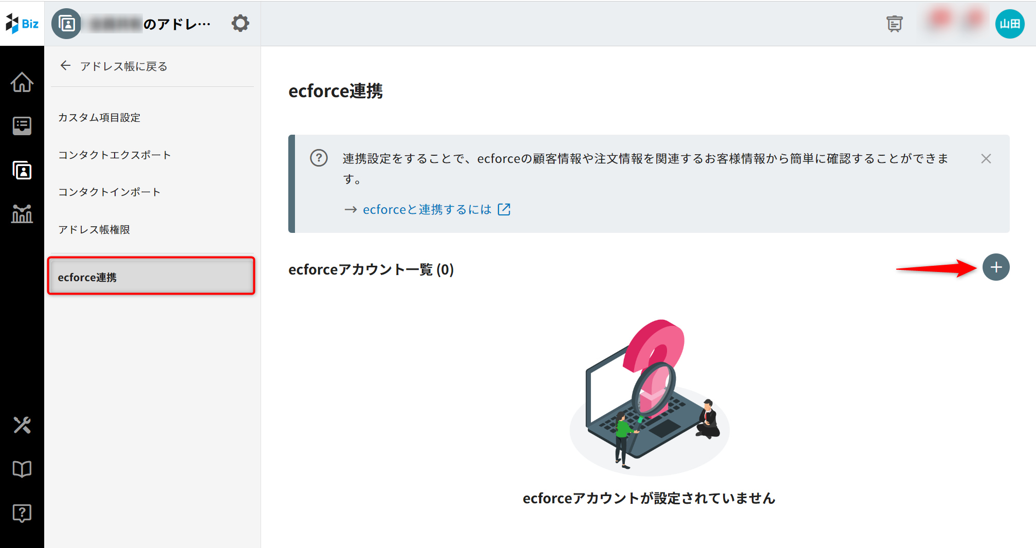 3.[ecforce連携]の設定画面にて、画面右側の+アイコンを選択します。ご注意