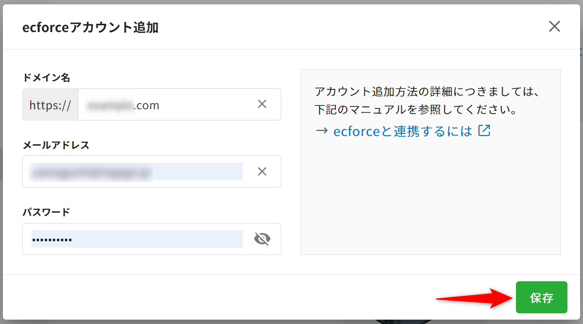 ・メールアドレス:ecforceのAPI接続用ユーザのメールアドレス