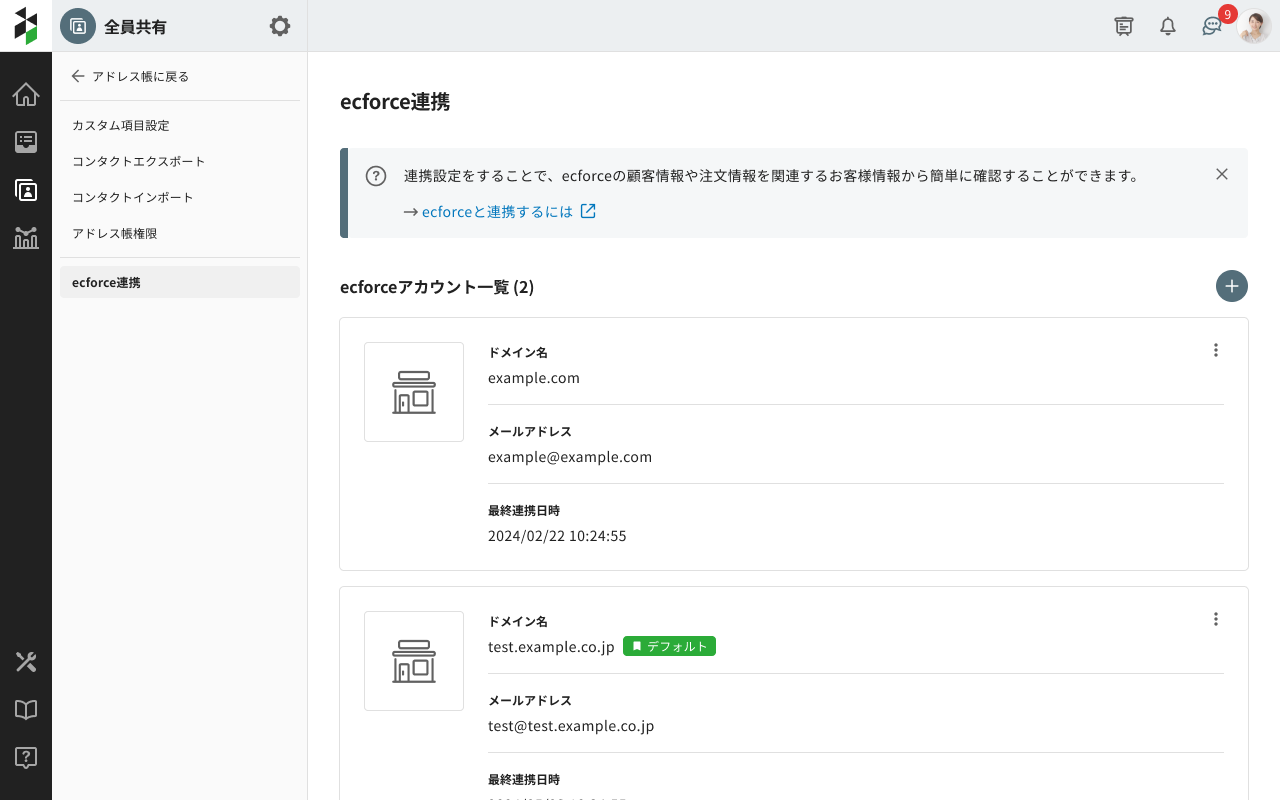 ・Re:lationにecforceの情報を表示するには、ecforce側の外部サービスAPI連携オプションのお申し込みが必要です。